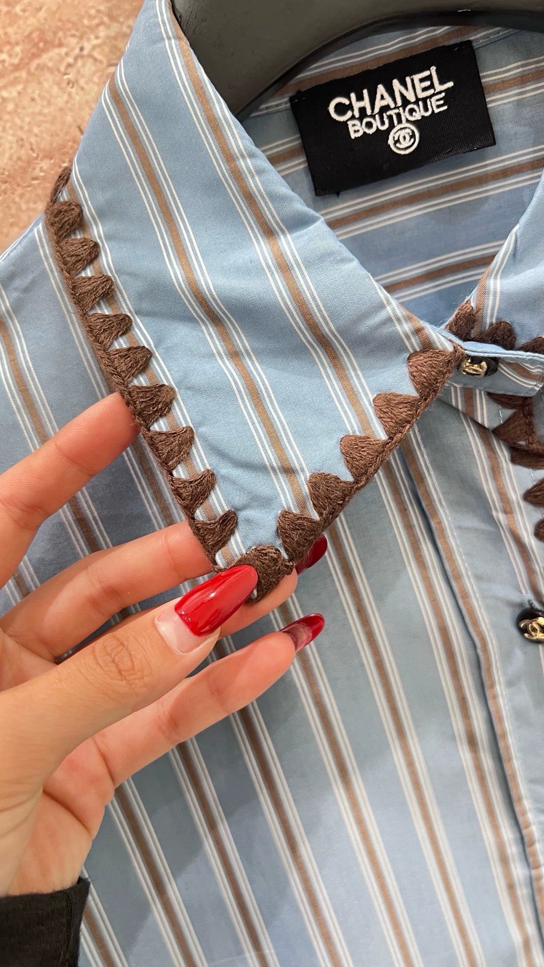 Light blue background with coffee stripes, exquisite shell embroidered lace collar design. The waist cinched lotus leaf edge design looks slim, and the long sleeved style is suitable for wearing in spring and autumn seasons.