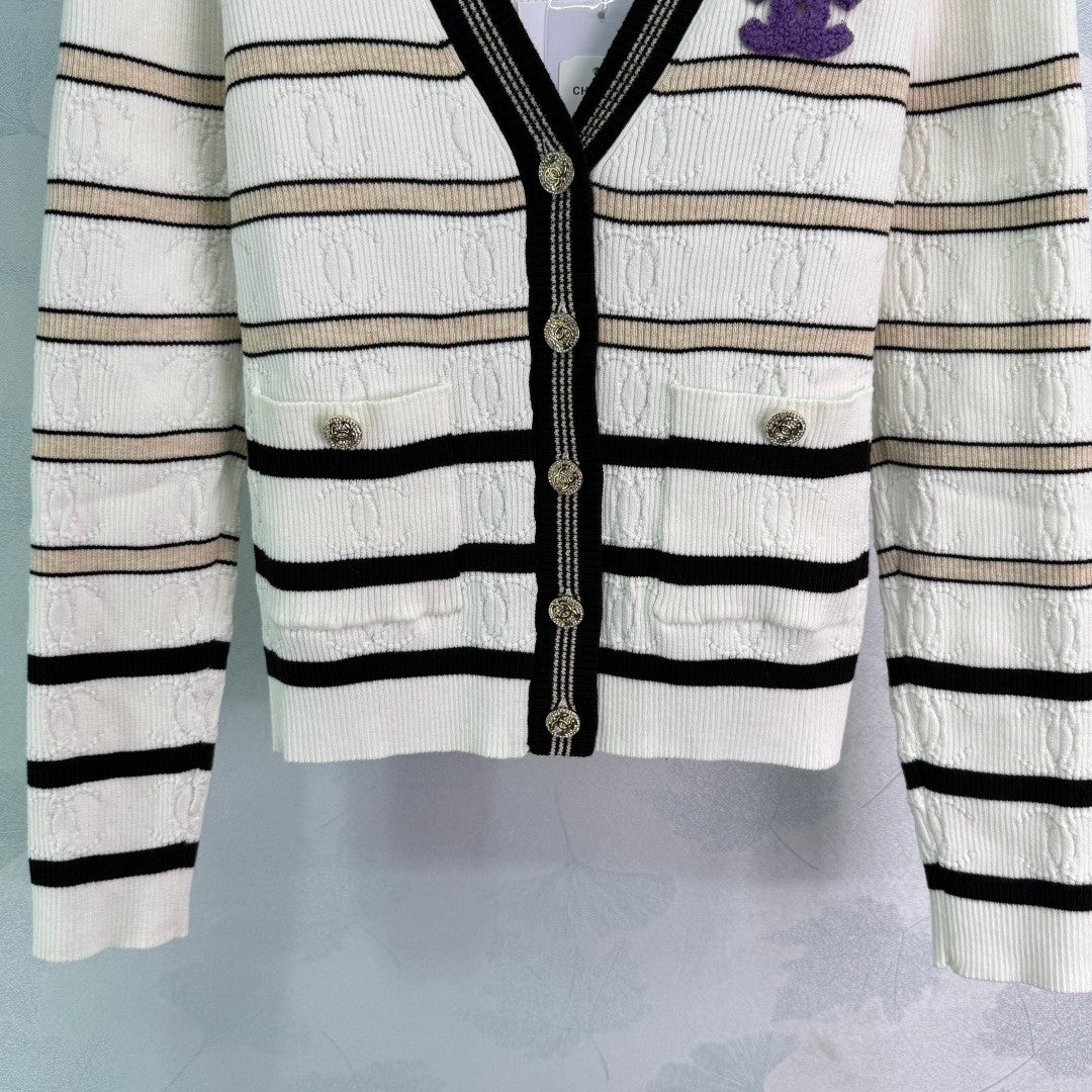 Imported yarn weaving texture, high-end and comfortable, soft V-neck knitted cardigan cut, all body vertical pit stripe texture pattern ➕ Double C dark pattern logo combined with contrasting stripes and threaded edges, easily highlighting full marks of detail and texture. Double C round buckle exquisite and stylish. Whole body contrasting stripes make it easy to wear elegantly or artistically versatile. Regular shoulder design, accommodating body shape, fashionable and casual