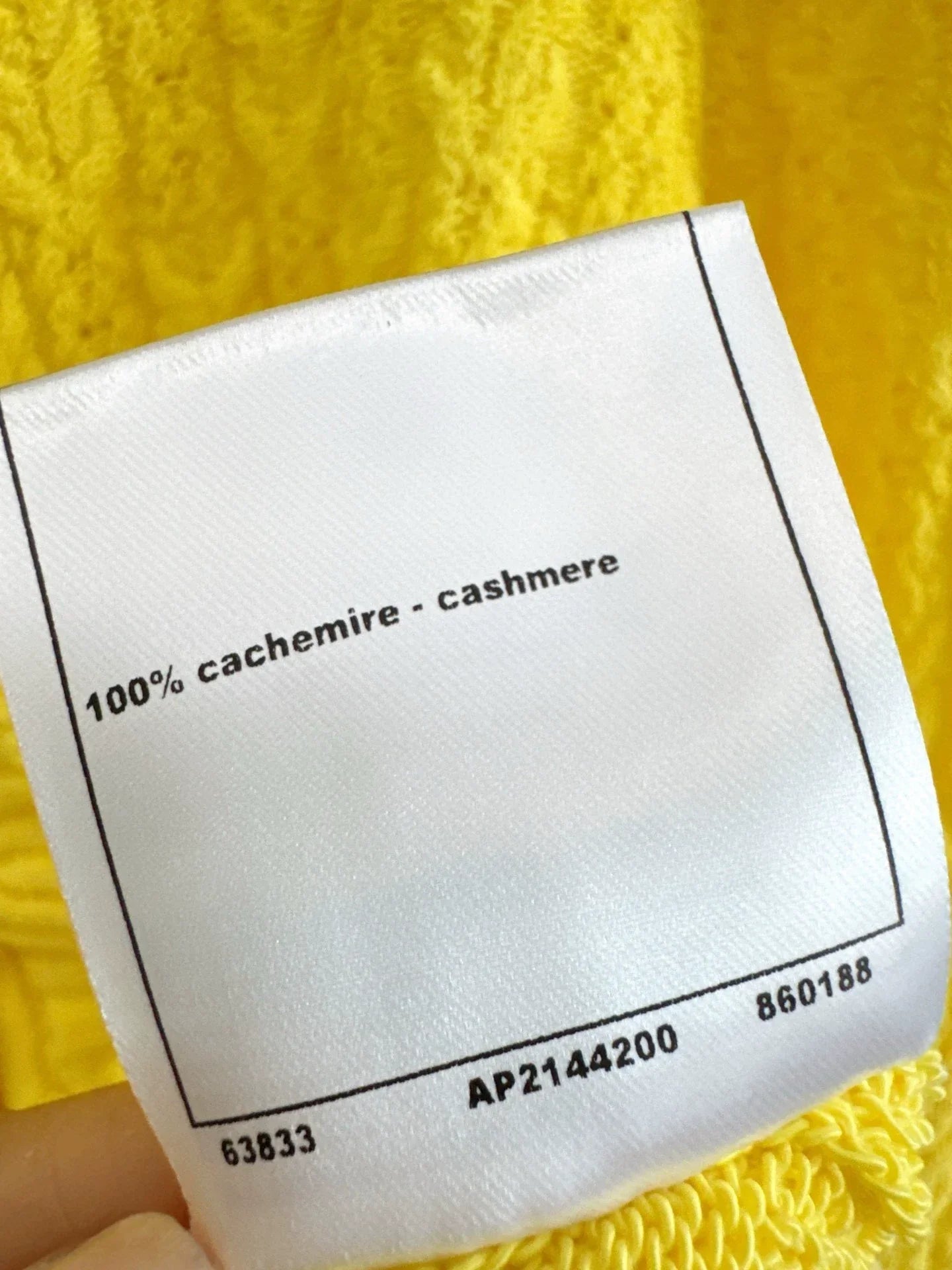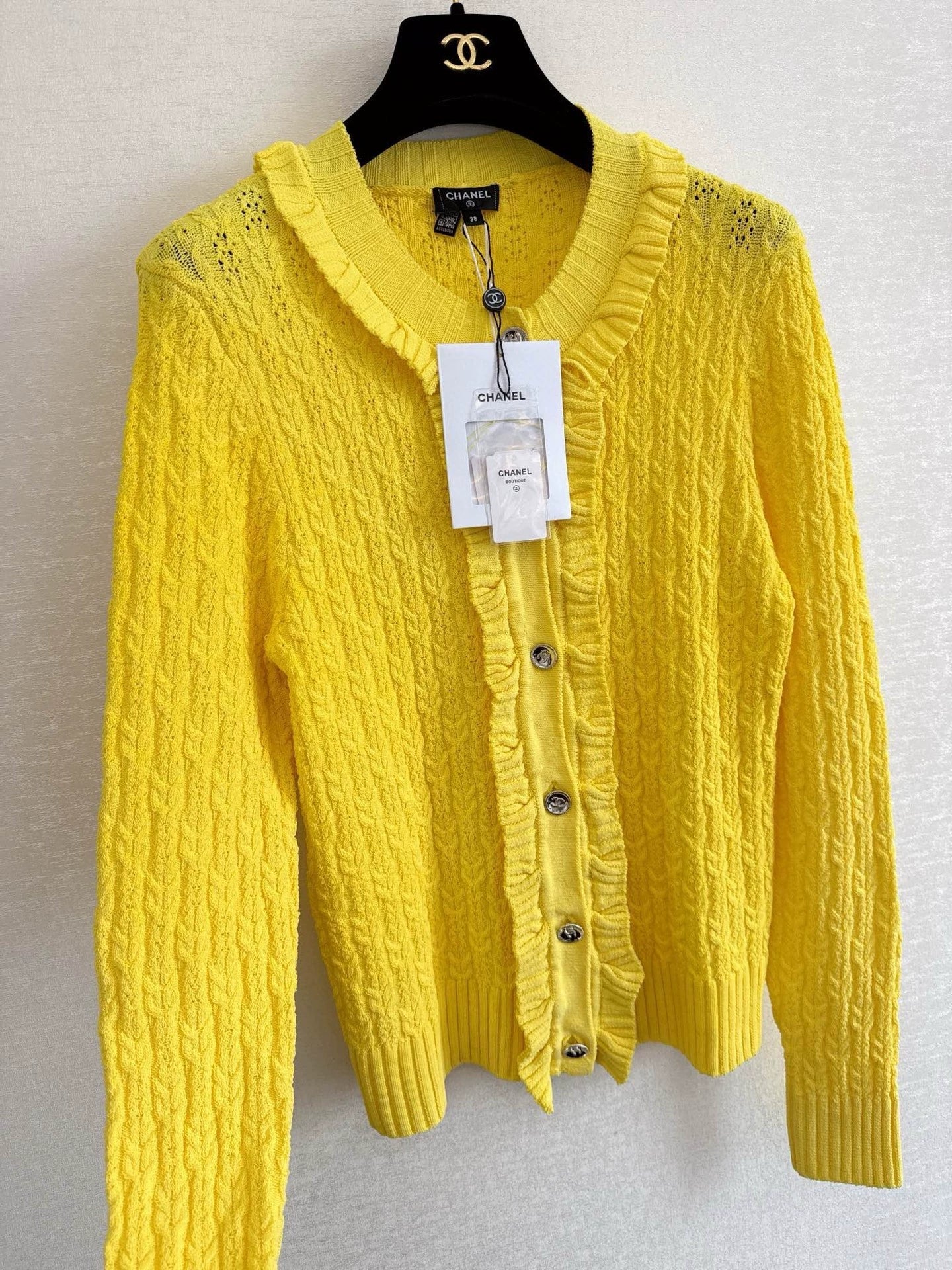 Wool yarn weaving, soft and comfortable, stylish and slimming. Round neck cardigan cut. The front and neckline are decorated with three-dimensional pleated lace to add a fashionable and romantic atmosphere. Exquisite details make it more luxurious and courtly. Paired with double C-printed round buckles, it highlights the elegant style of a lady. With the large wheat ear-feeling slightly hollowed-out texture, it is exquisite and eye-catching.