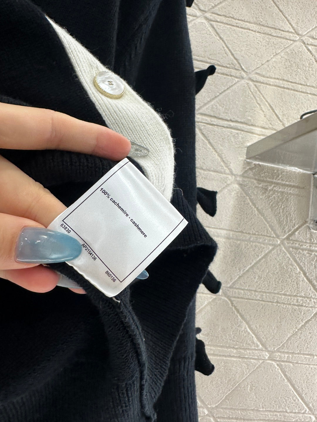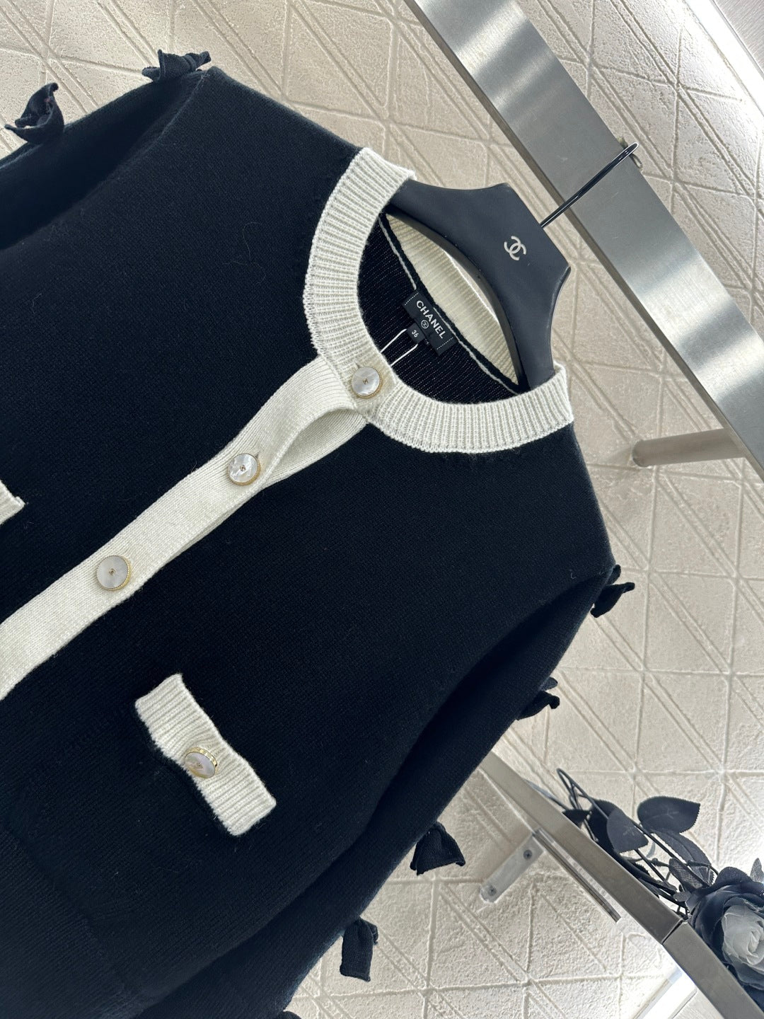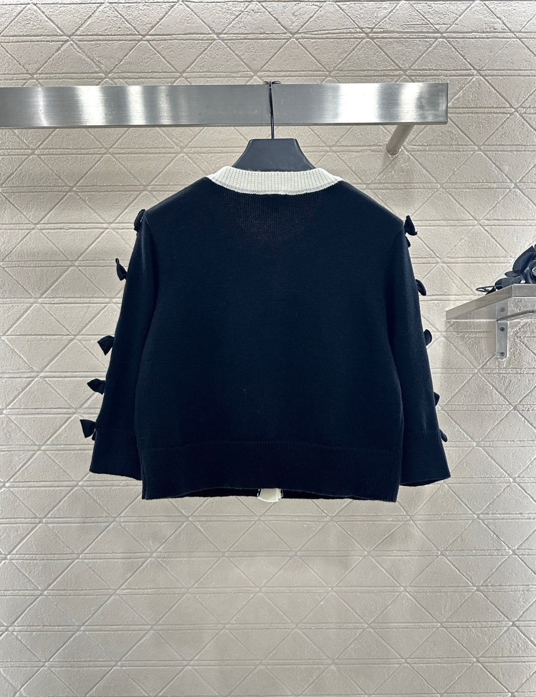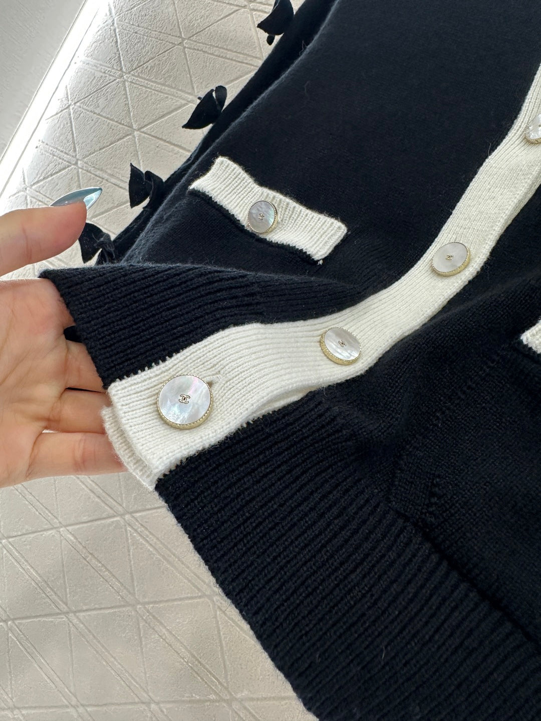 Cashmere yarn weaving texture, glossy and soft, skin friendly, mid sleeve knitted cardigan, loose texture without losing fashion sense, collar edge extending to the front, contrasting color edging, elastic thread throughout the body, striped edging, sleeve outer hollow out ➕ Three dimensional bow decoration with round buckle and mother of pearl luster, combined with double C letter logo decoration, showcasing a playful and youthful style
