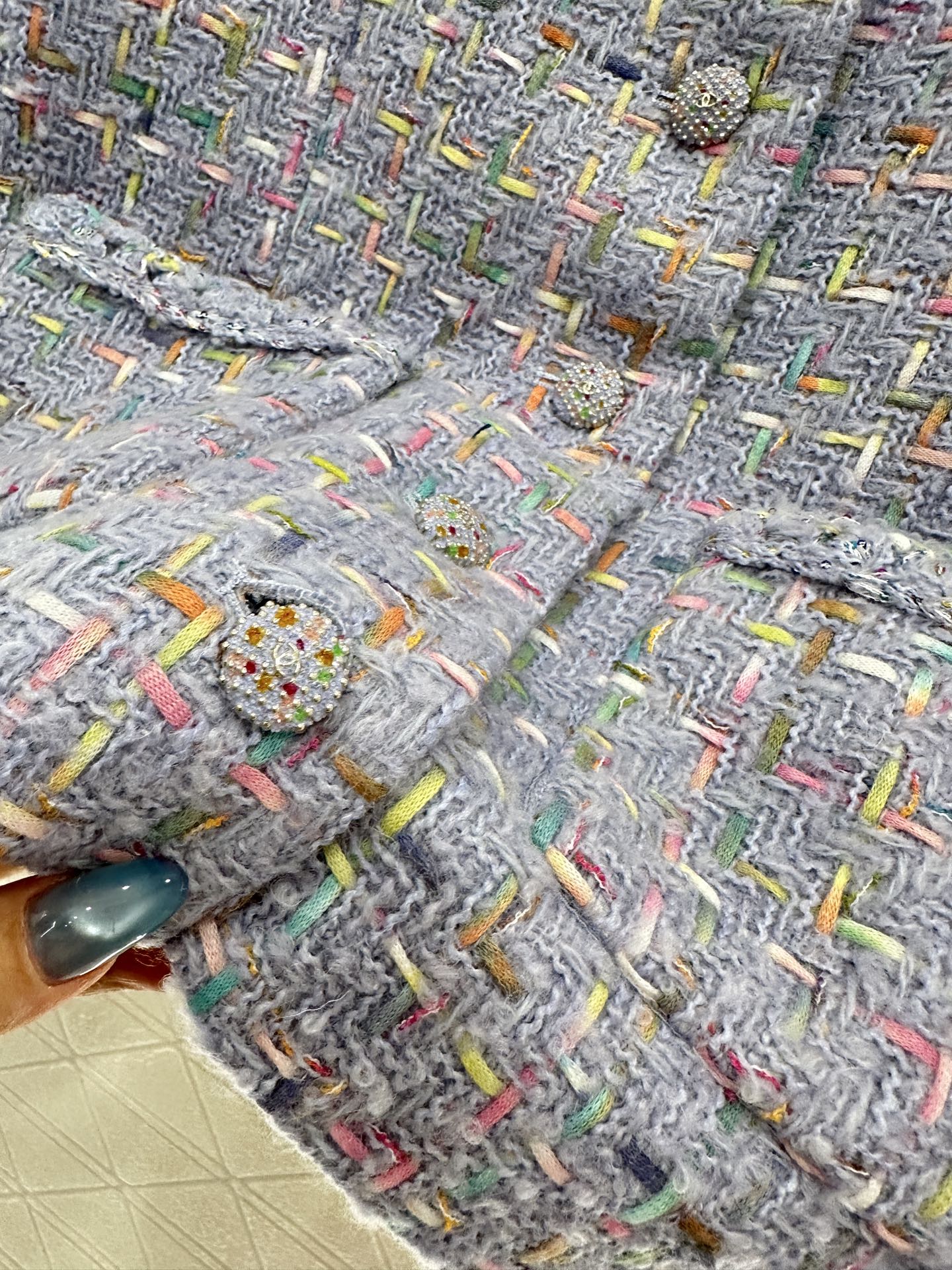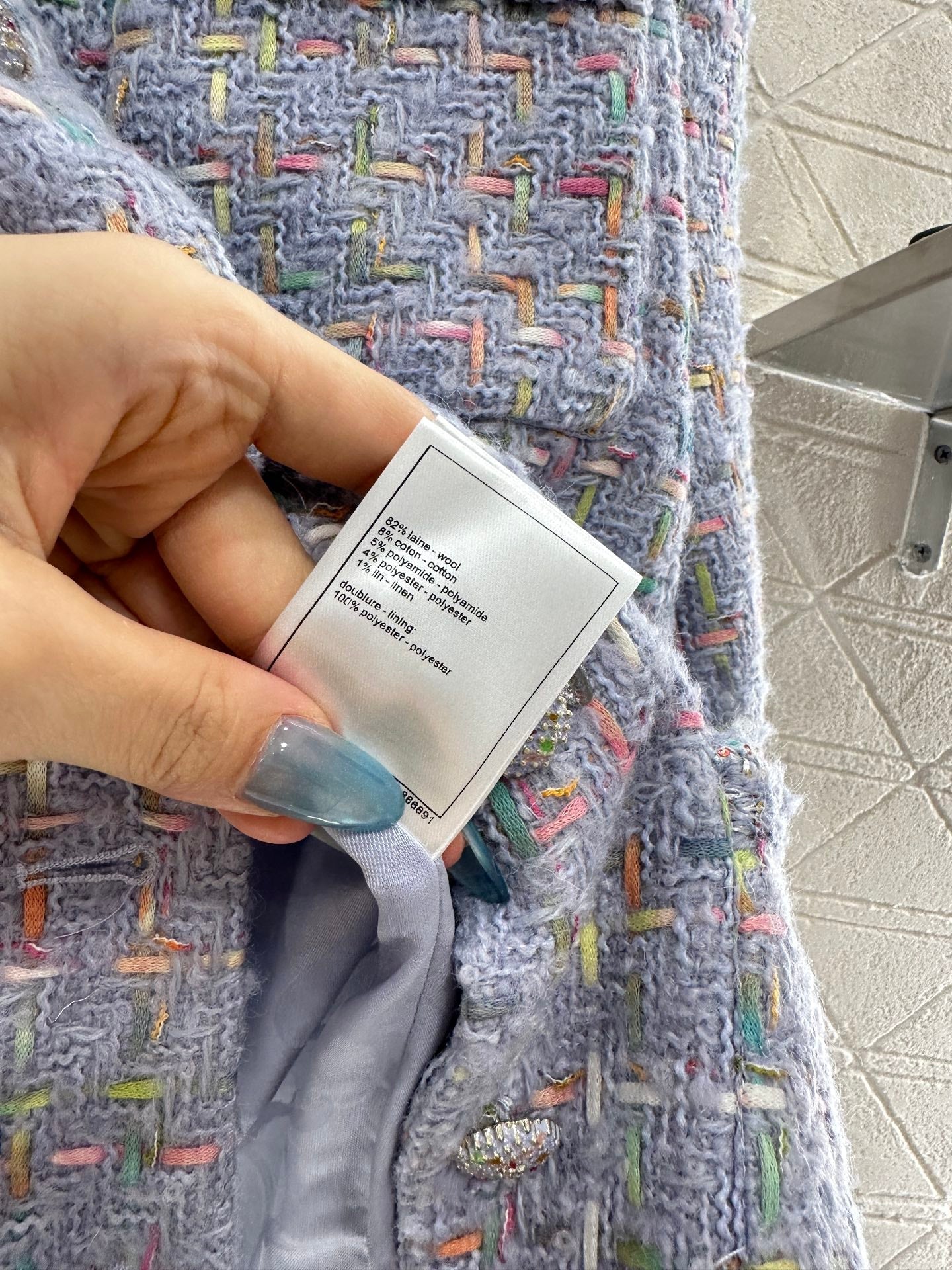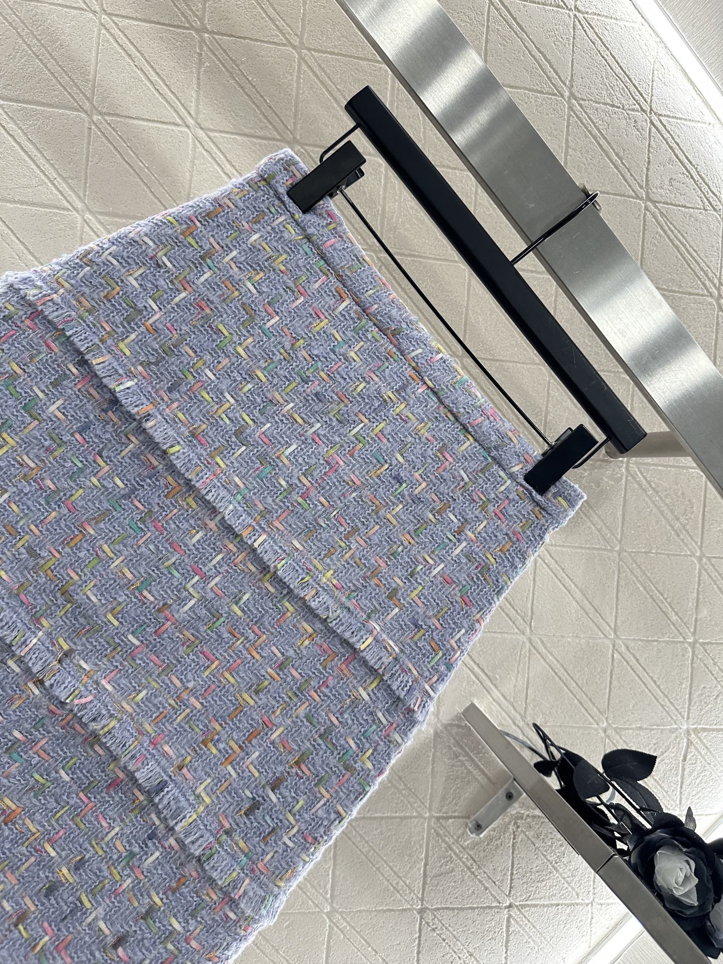 Made of high-quality woolen fabric, with a full appearance, this round neck dress has a tailored design that fits the human body. The shoulder pads on the front of the garment are designed to enhance the slender and upright figure. The large body has multiple pockets, and the three-dimensional weaving edge lights up the details. The blue purple base color, combined with delicate colored yarn rules, interweaves the texture and covers the whole body, highlighting the socialite's style. The same series of straight tube skirts have multiple layers of wool details, perfectly interpreting the elegant and luxurious feeling. The complete set highlights the texture and is intellectual and gentle, making it the perfect choice for attending formal occasions