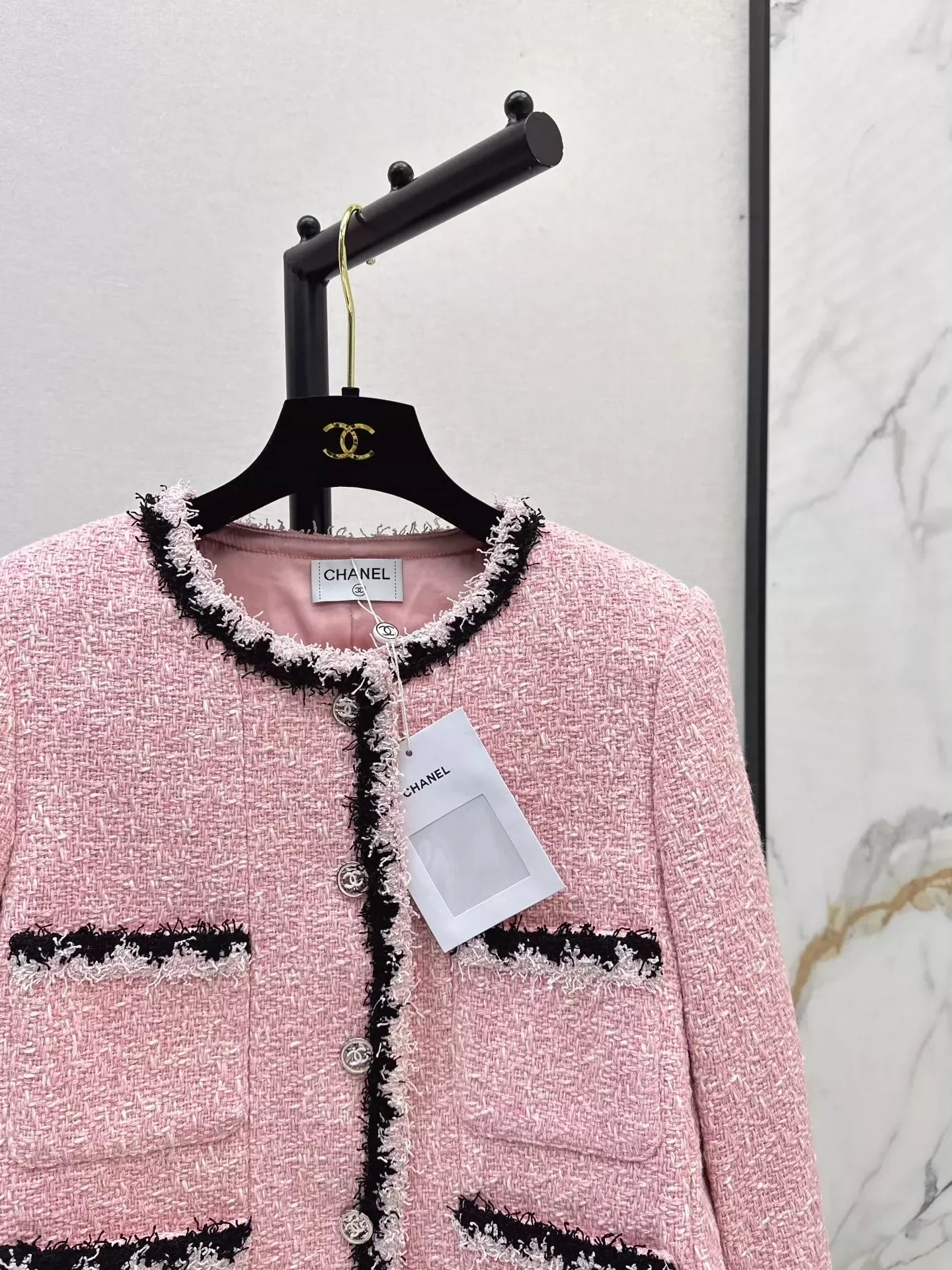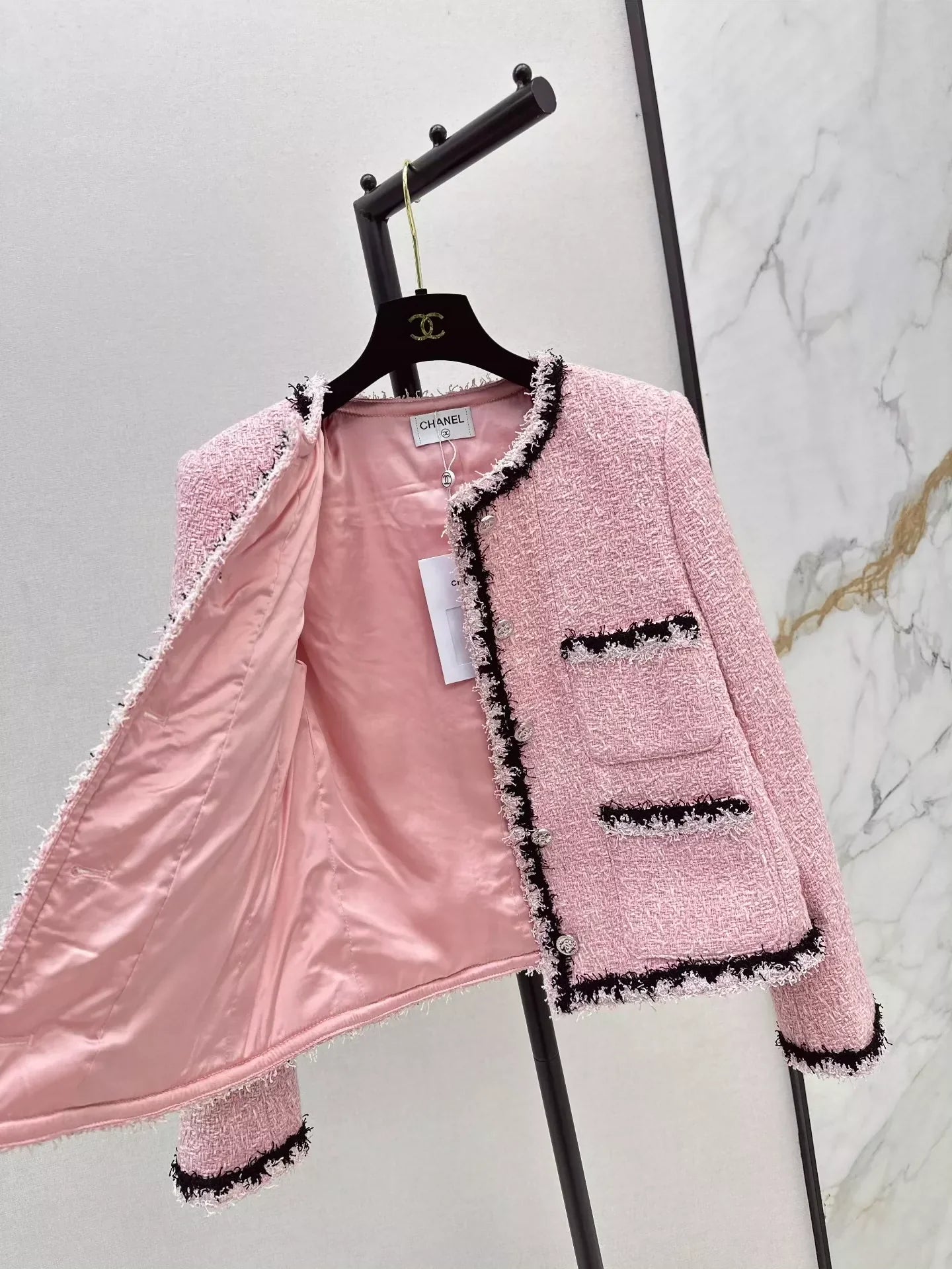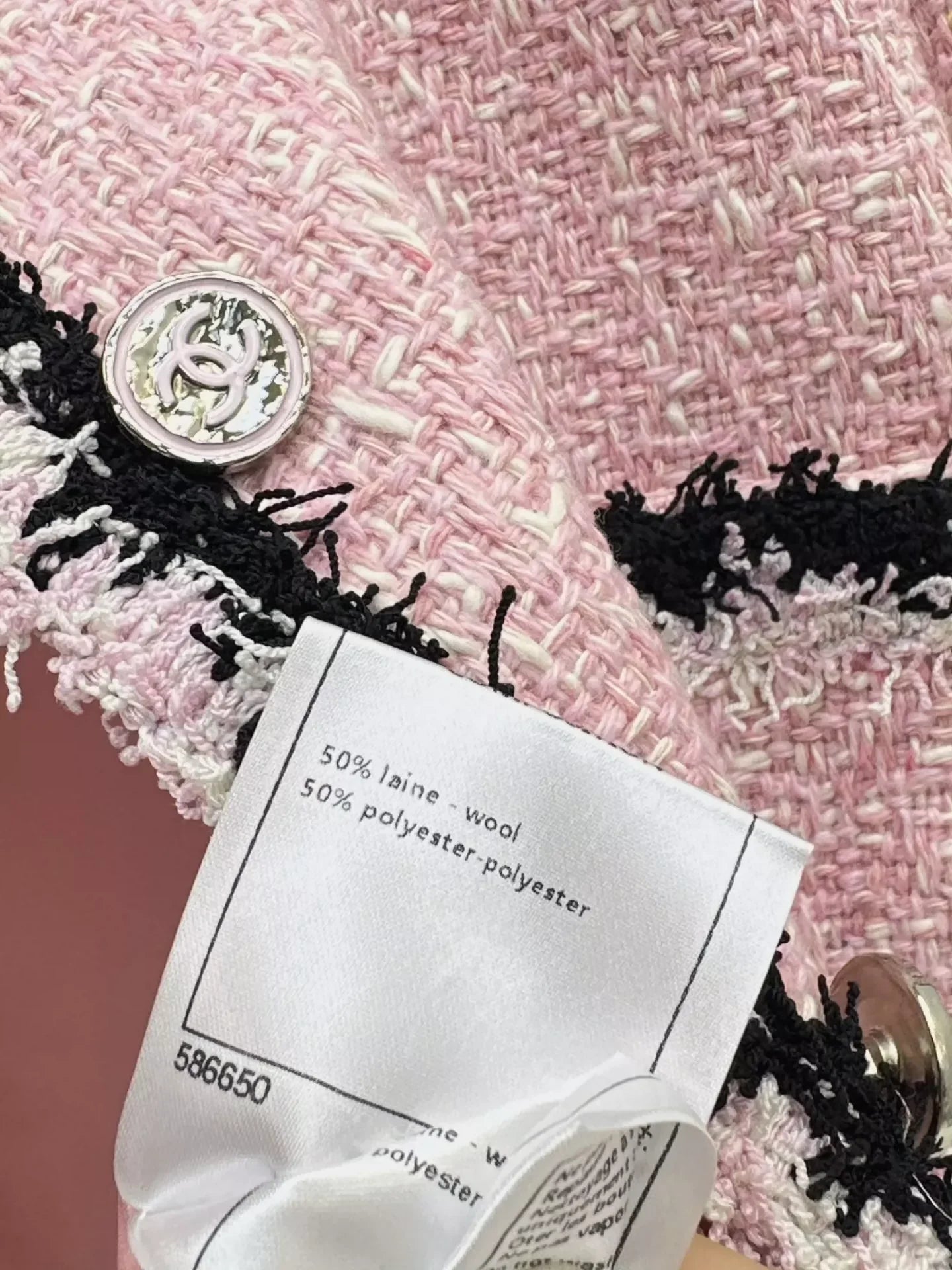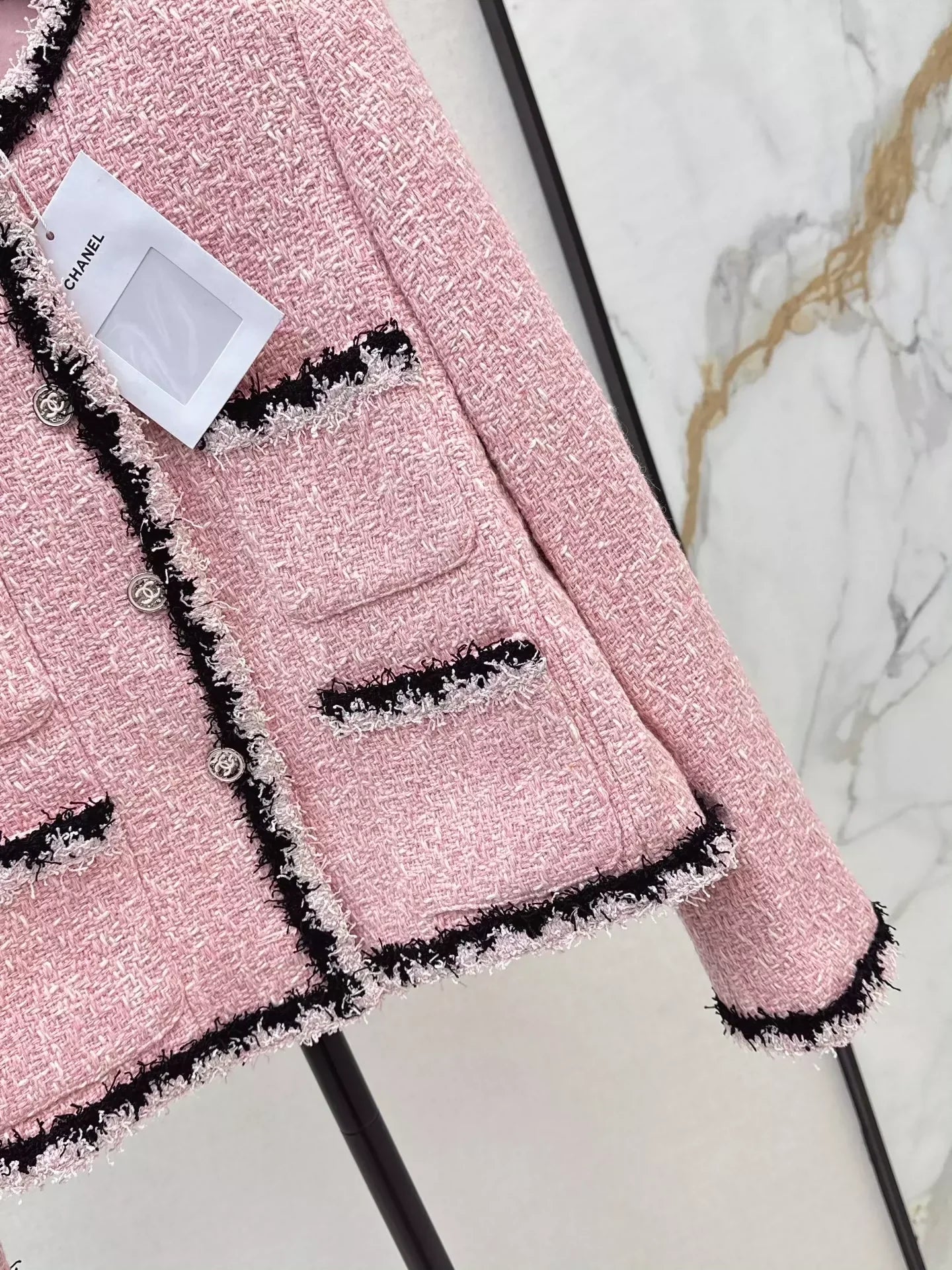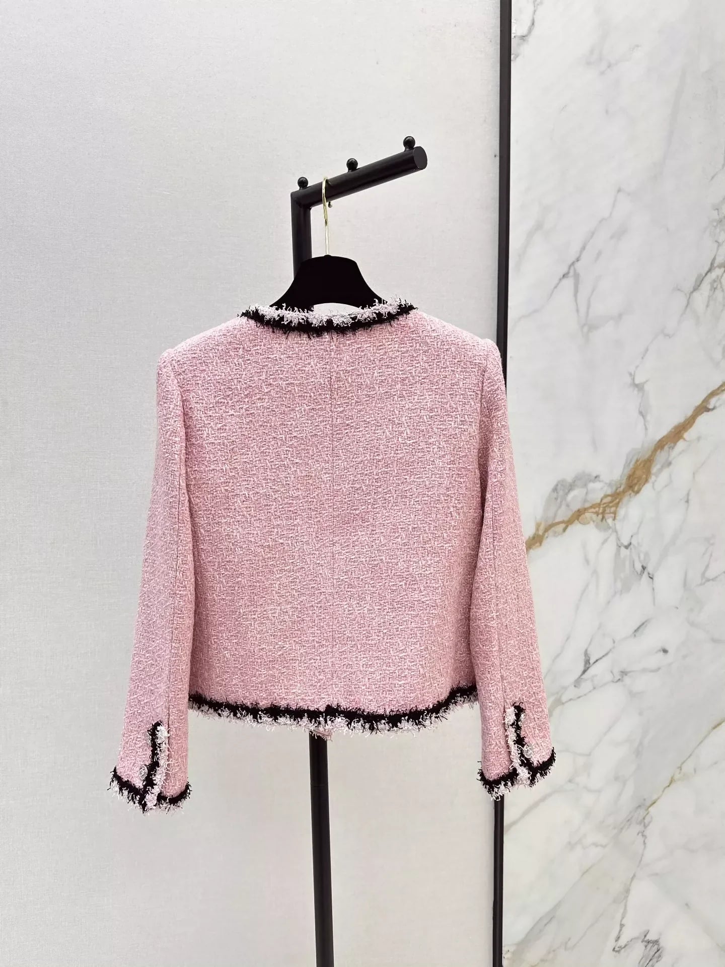 Woven strap border design lapel jacket for wealthy ladies exudes a noble temperament on the upper body, which can be elegant or casual. The color matching is very beautiful, and the custom-made black and pink woven tape fabric is also very special with button details. Online