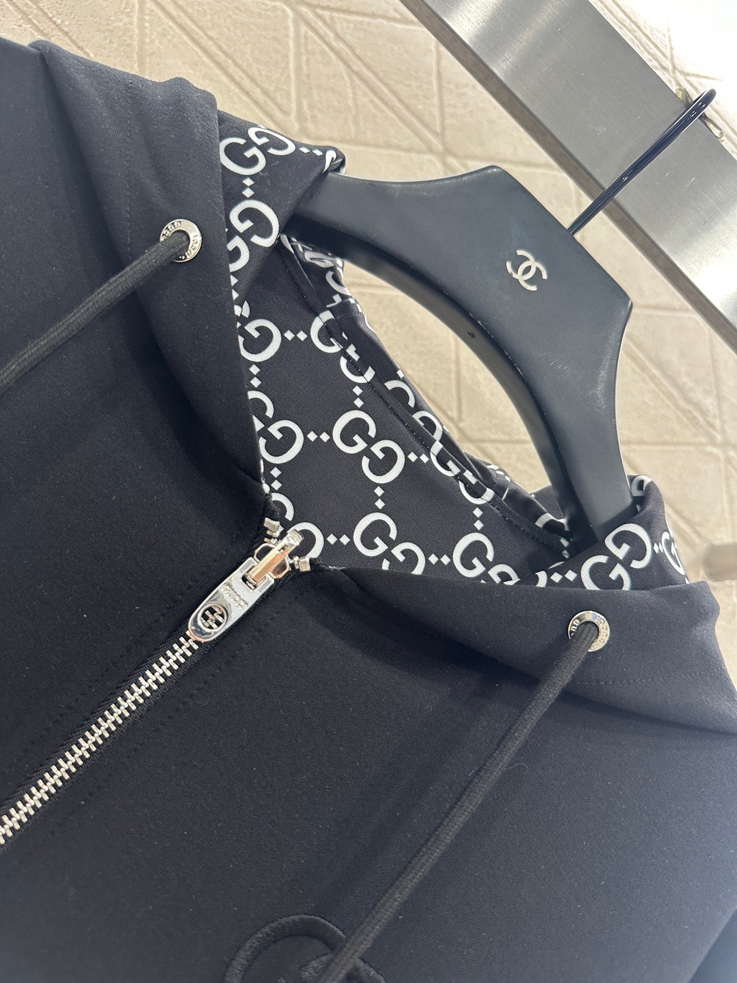 Made of all cotton material, with a glossy texture and comfortable drape. Hooded jacket cut, fashionable and casual, designed to be worn on both sides. One side is adorned with a double G letter logo with diamond grid distribution, instantly enhancing the brand's style and enriching the visual effect, making it more fashionable. The other side is durable and versatile in plain colors, making it look slim and adding vitality. Paired with straight leg leg pants of the same series, it responds to the style from top to bottom, and the logo makes it more personalized and casual, increasing the sense of styling. The complete set is simple and high-end, essential for daily wear. A guide for daily casual wear, relaxed and fashionable