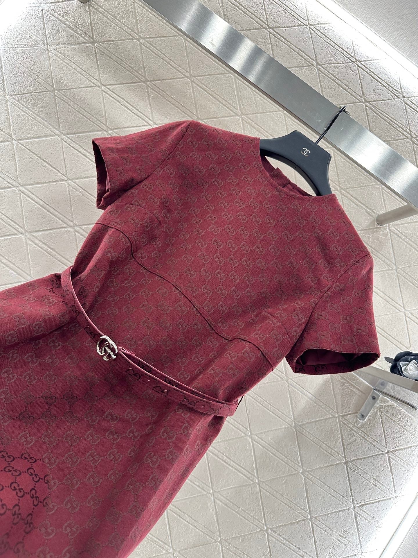 Imported jacquard material texture, high-end and comfortable, short sleeved dress cut and ready to wear, featuring a double G letter logo jacquard with a strong sense of old money as the design highlight. The three-dimensional contour line cutting design of the chest and waist makes it more fashionable. The waist side is effectively narrowed and the curves are outlined with double G belts, making it appear slimmer. The regular waist cinching design