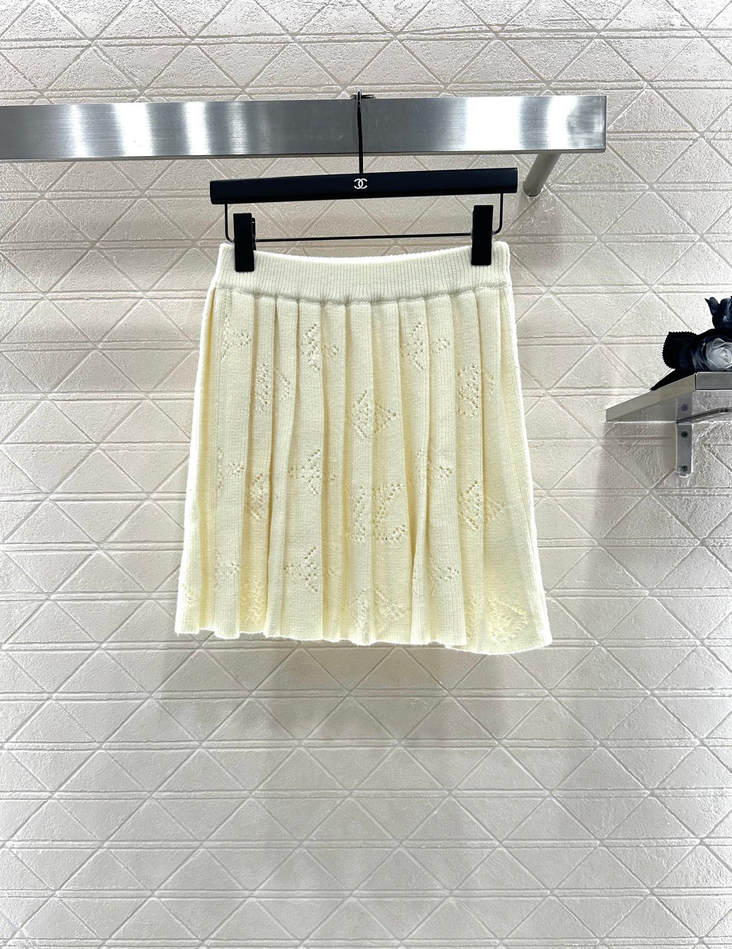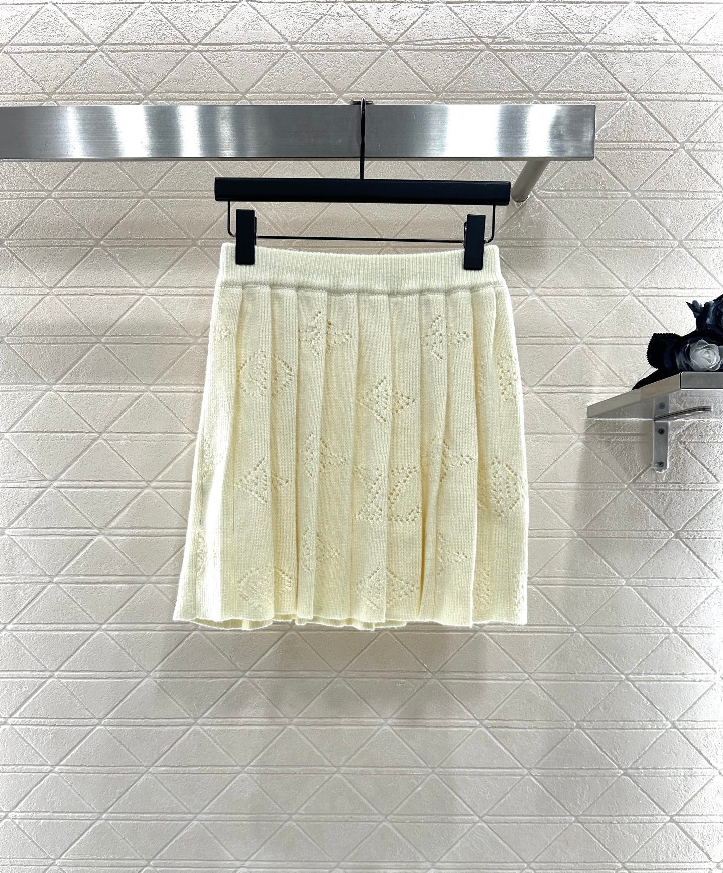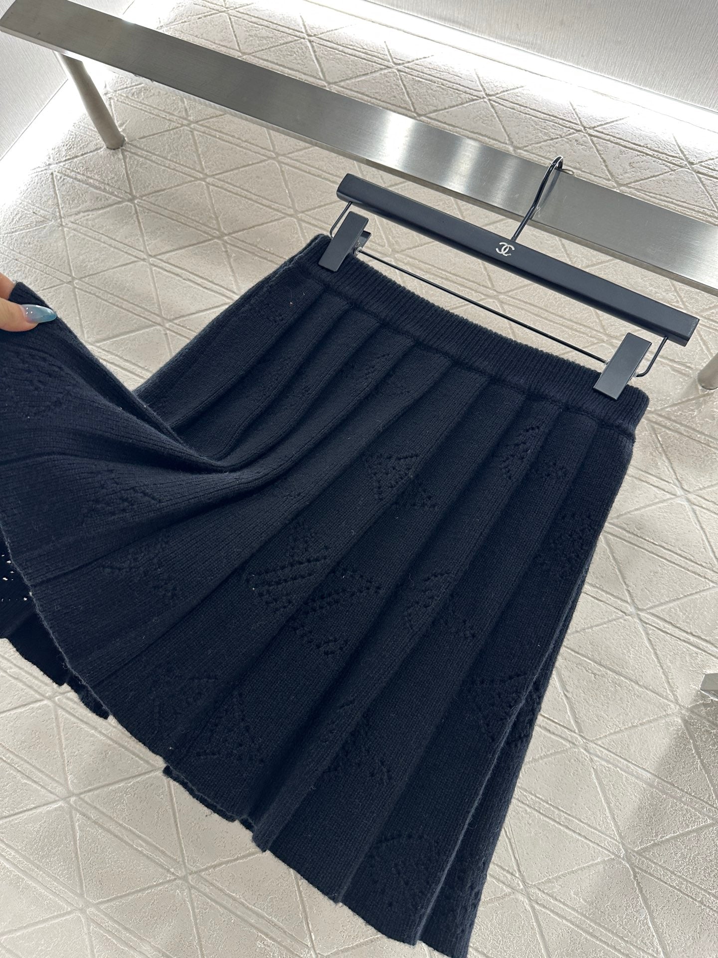 Woolen yarn weaving, jacquard processing, presenting a hollow shape, knitted round neck cardigan version, finished garment button decoration cardigan, with elastic groove thread edging to narrow, letter clover logo buckle design to maintain a unified tone, the overall shape is high-end and casual, matched with the same series of elastic high waisted pleated short skirts, collision creates a fashionable tone, creating the brand's unique fashionable style.