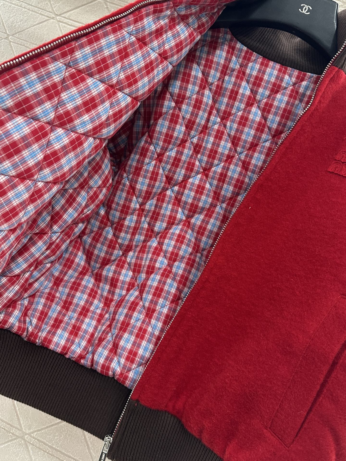 Cashmere, wool material, down cotton filling, whole lightweight and warm stand up collar jacket, cut with threaded grooves and edging, deep brown and large body red to form a color and fabric collision design feeling. The inner side of the jacket is filled with diamond grid embossed pattern and grid fabric, with large capacity pockets on both sides to add three-dimensional wearing. The iconic letter decoration in front of the chest presents the brand concept of inclusiveness, warmth, and lightweight fashion