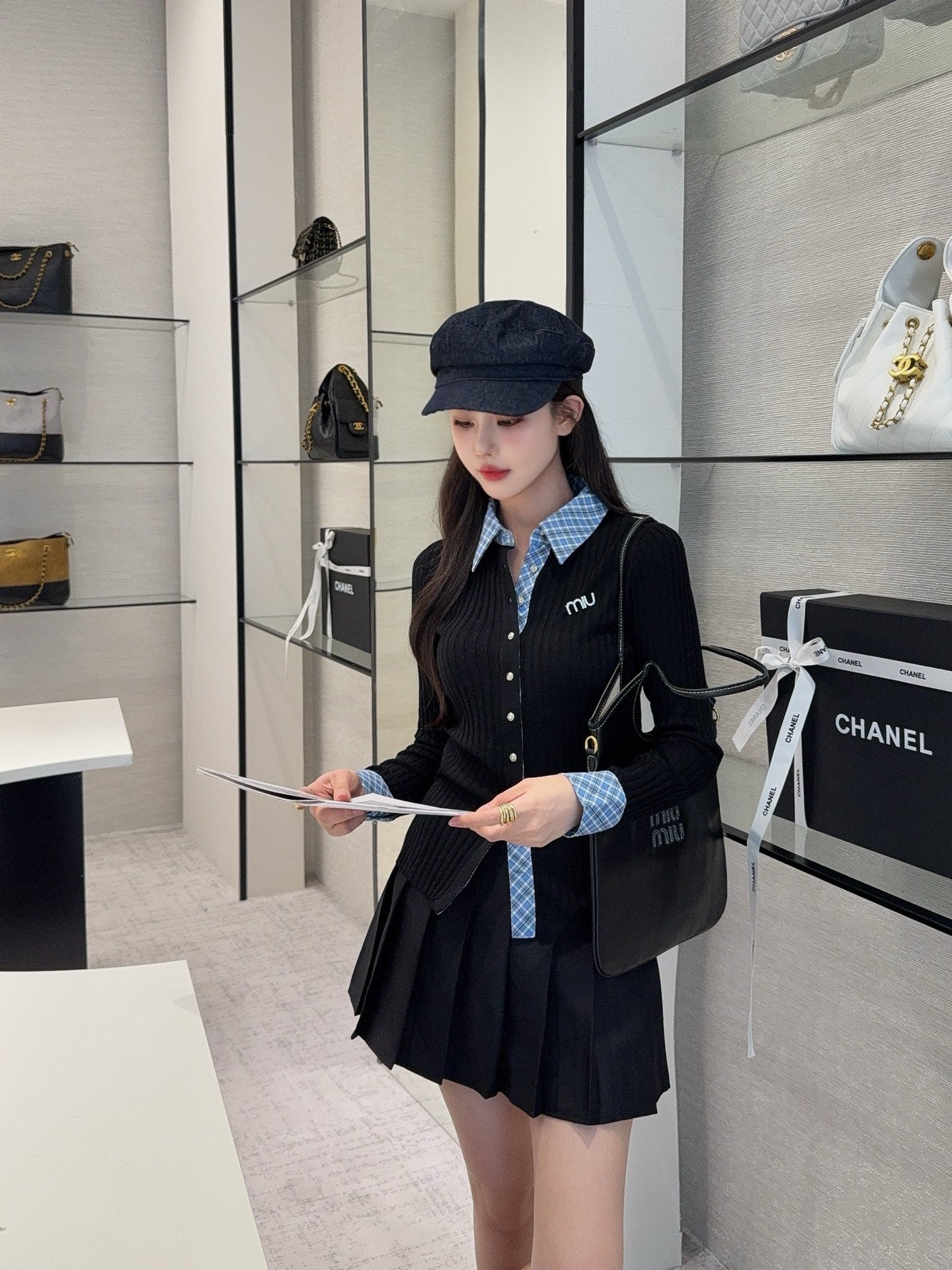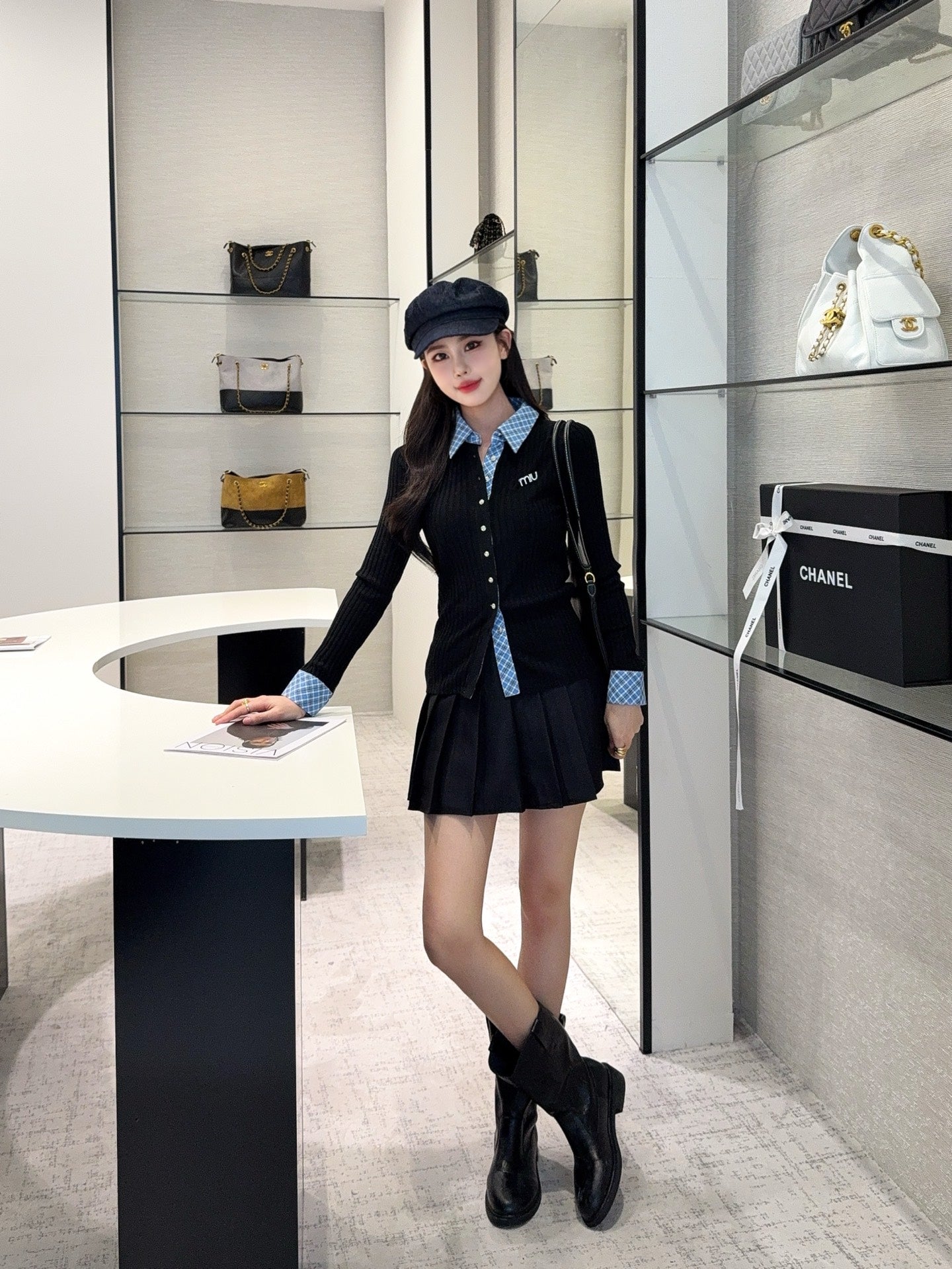 25 New plaid stitching fake two-piece sweater(WHITE/BLACK)
